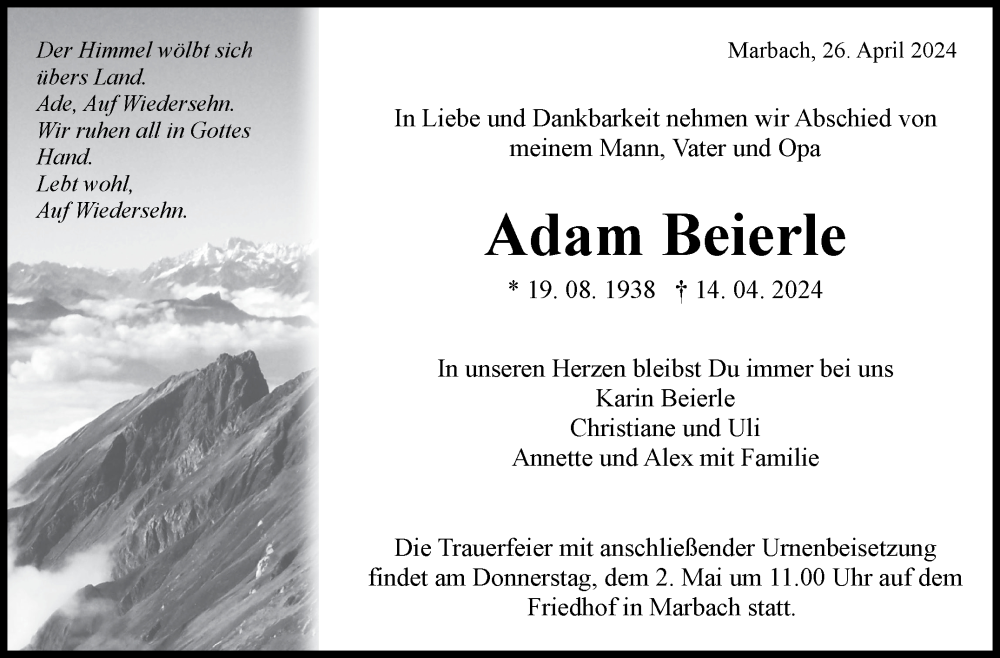 Hier finden Sie alle Traueranzeigen aus der Zeitung, die bisher für Adam Beierle erschienen sind. Weitere Traueranzeigen, die in der Zeitung erscheinen, werden hier ebenfalls aufgelistet