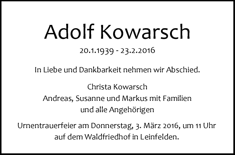 Hier finden Sie alle Traueranzeigen aus der Zeitung, die bisher für Adolf Kowarsch erschienen sind. Weitere Traueranzeigen, die in der Zeitung erscheinen, werden hier ebenfalls aufgelistet