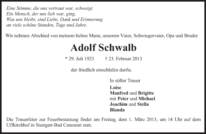 Hier finden Sie alle Traueranzeigen aus der Zeitung, die bisher für Adolf Schwalb erschienen sind. Weitere Traueranzeigen, die in der Zeitung erscheinen, werden hier ebenfalls aufgelistet