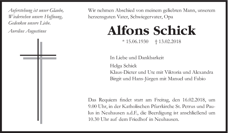 Hier finden Sie alle Traueranzeigen aus der Zeitung, die bisher für Alfons Schick erschienen sind. Weitere Traueranzeigen, die in der Zeitung erscheinen, werden hier ebenfalls aufgelistet