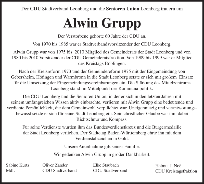 Hier finden Sie alle Traueranzeigen aus der Zeitung, die bisher für Alwin Grupp erschienen sind. Weitere Traueranzeigen, die in der Zeitung erscheinen, werden hier ebenfalls aufgelistet