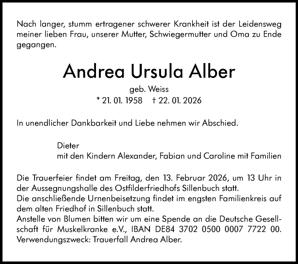 Hier finden Sie alle Traueranzeigen aus der Zeitung, die bisher für Andrea Ursula Alber erschienen sind. Weitere Traueranzeigen, die in der Zeitung erscheinen, werden hier ebenfalls aufgelistet