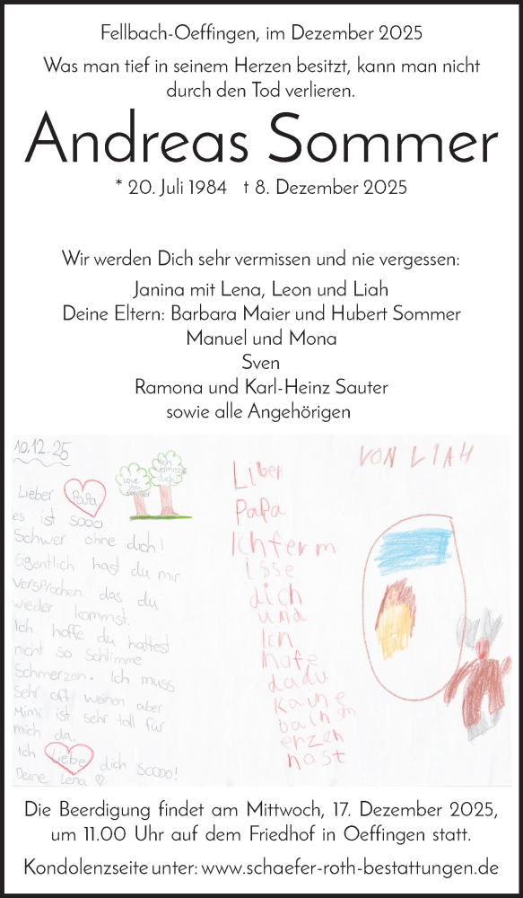 Hier finden Sie alle Traueranzeigen aus der Zeitung, die bisher für Andreas Sommer erschienen sind. Weitere Traueranzeigen, die in der Zeitung erscheinen, werden hier ebenfalls aufgelistet