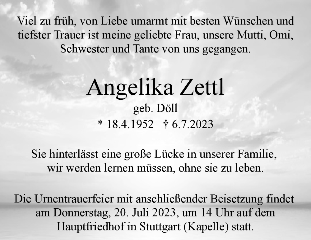 Hier finden Sie alle Traueranzeigen aus der Zeitung, die bisher für Angelika Zettl erschienen sind. Weitere Traueranzeigen, die in der Zeitung erscheinen, werden hier ebenfalls aufgelistet