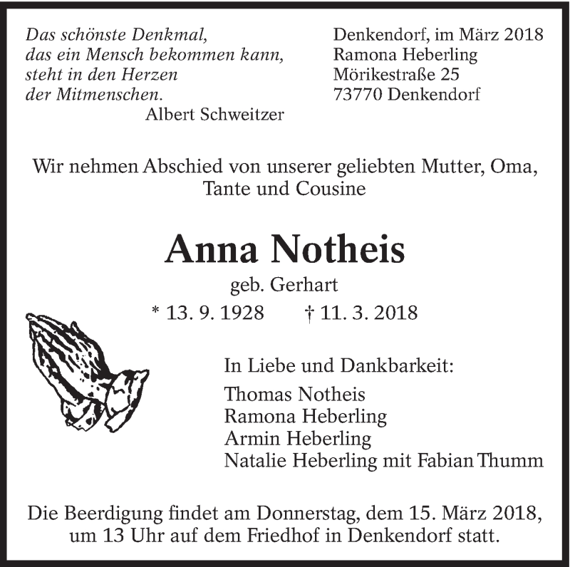 Hier finden Sie alle Traueranzeigen aus der Zeitung, die bisher für Anna Notheis erschienen sind. Weitere Traueranzeigen, die in der Zeitung erscheinen, werden hier ebenfalls aufgelistet