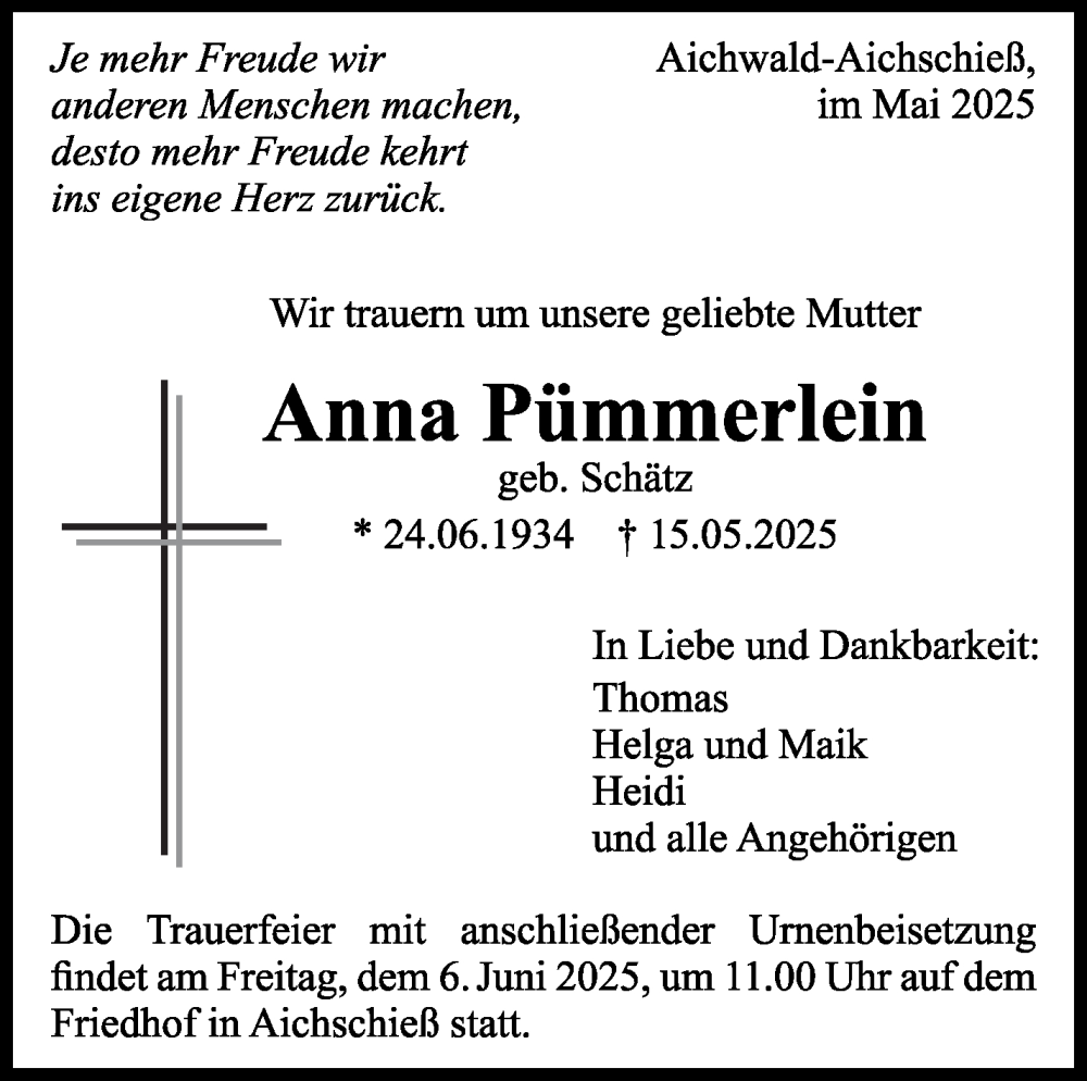 Hier finden Sie alle Traueranzeigen aus der Zeitung, die bisher für Anna Pümmerlein erschienen sind. Weitere Traueranzeigen, die in der Zeitung erscheinen, werden hier ebenfalls aufgelistet