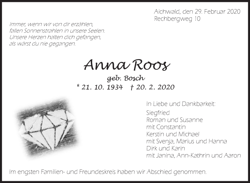 Hier finden Sie alle Traueranzeigen aus der Zeitung, die bisher für Anna Roos erschienen sind. Weitere Traueranzeigen, die in der Zeitung erscheinen, werden hier ebenfalls aufgelistet