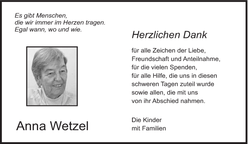 Hier finden Sie alle Traueranzeigen aus der Zeitung, die bisher für Anna Wetzel erschienen sind. Weitere Traueranzeigen, die in der Zeitung erscheinen, werden hier ebenfalls aufgelistet