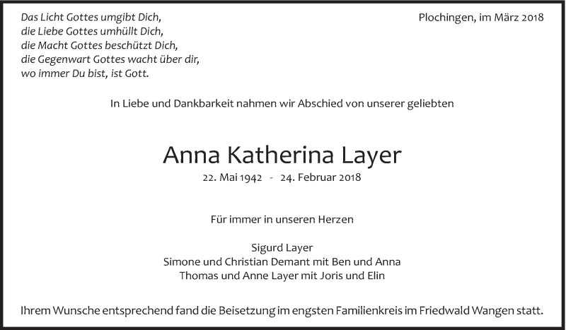 Hier finden Sie alle Traueranzeigen aus der Zeitung, die bisher für Anna Katherina Layer erschienen sind. Weitere Traueranzeigen, die in der Zeitung erscheinen, werden hier ebenfalls aufgelistet