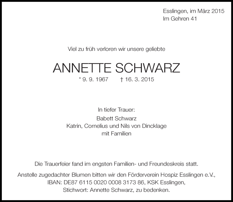 Hier finden Sie alle Traueranzeigen aus der Zeitung, die bisher für Annette Schwarz erschienen sind. Weitere Traueranzeigen, die in der Zeitung erscheinen, werden hier ebenfalls aufgelistet