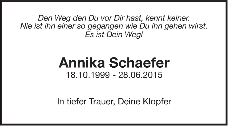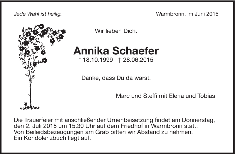 Hier finden Sie alle Traueranzeigen aus der Zeitung, die bisher für Annika Schaefer erschienen sind. Weitere Traueranzeigen, die in der Zeitung erscheinen, werden hier ebenfalls aufgelistet