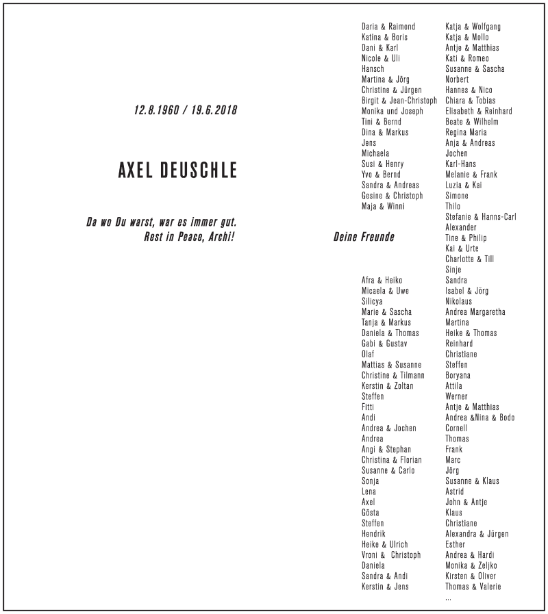 Hier finden Sie alle Traueranzeigen aus der Zeitung, die bisher für Axel Deuschle erschienen sind. Weitere Traueranzeigen, die in der Zeitung erscheinen, werden hier ebenfalls aufgelistet