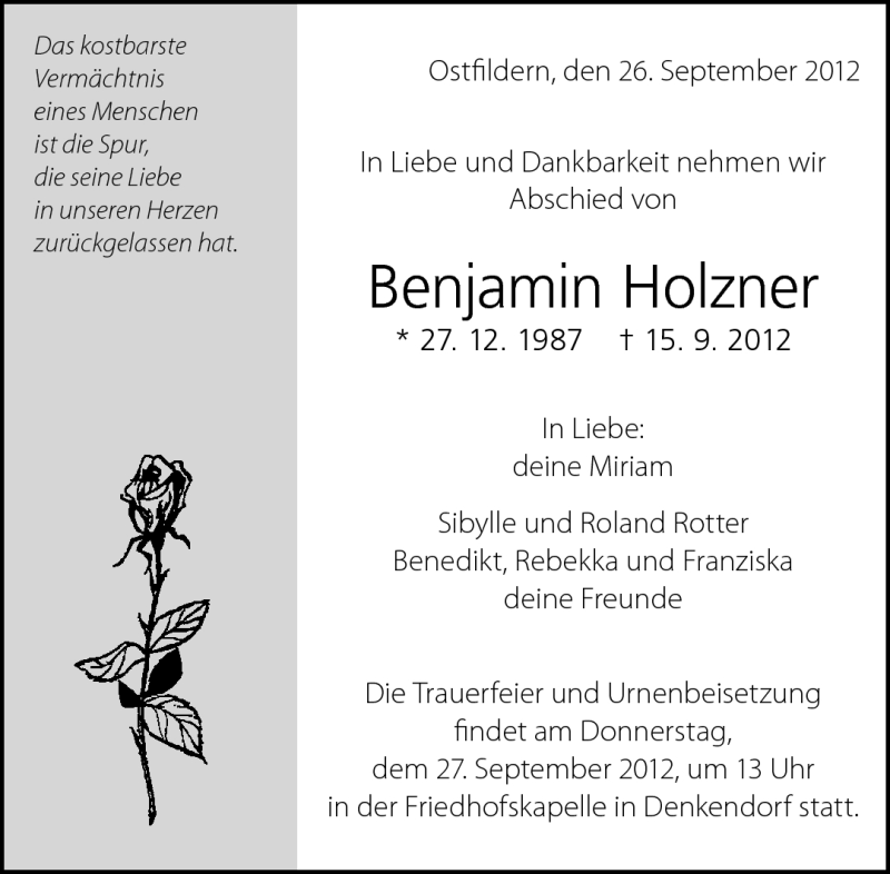 Hier finden Sie alle Traueranzeigen aus der Zeitung, die bisher für Benjamin Holzner erschienen sind. Weitere Traueranzeigen, die in der Zeitung erscheinen, werden hier ebenfalls aufgelistet