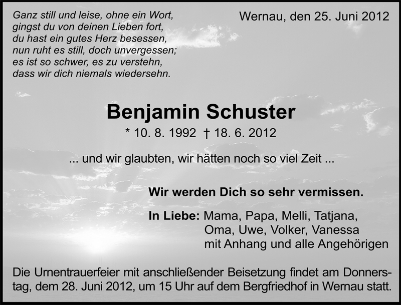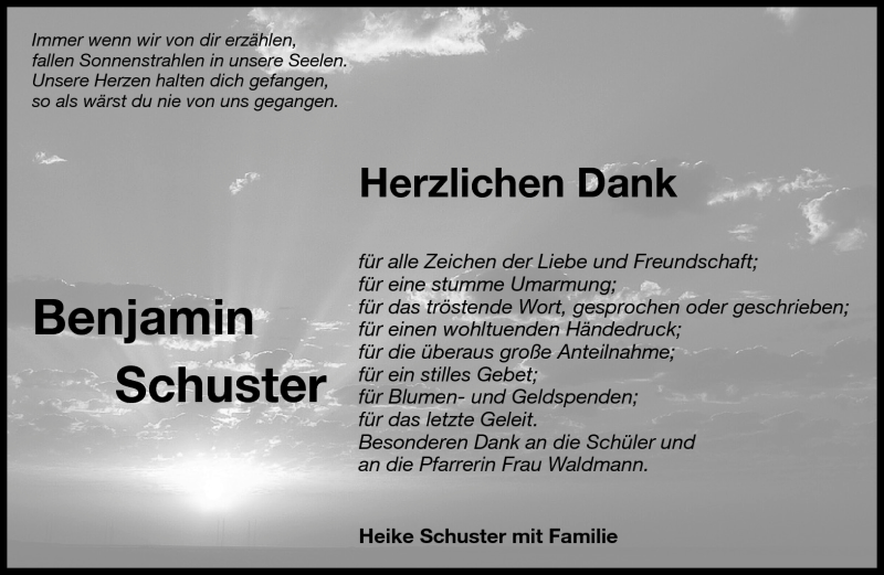 Hier finden Sie alle Traueranzeigen aus der Zeitung, die bisher für Benjamin Schuster erschienen sind. Weitere Traueranzeigen, die in der Zeitung erscheinen, werden hier ebenfalls aufgelistet