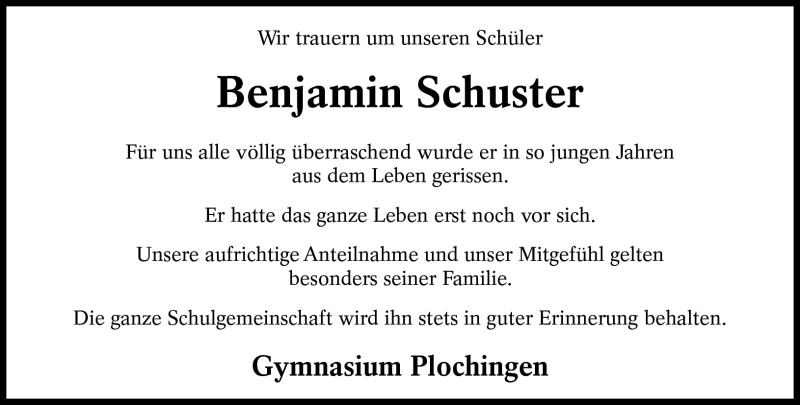 Hier finden Sie alle Traueranzeigen aus der Zeitung, die bisher für Benjamin Schuster erschienen sind. Weitere Traueranzeigen, die in der Zeitung erscheinen, werden hier ebenfalls aufgelistet