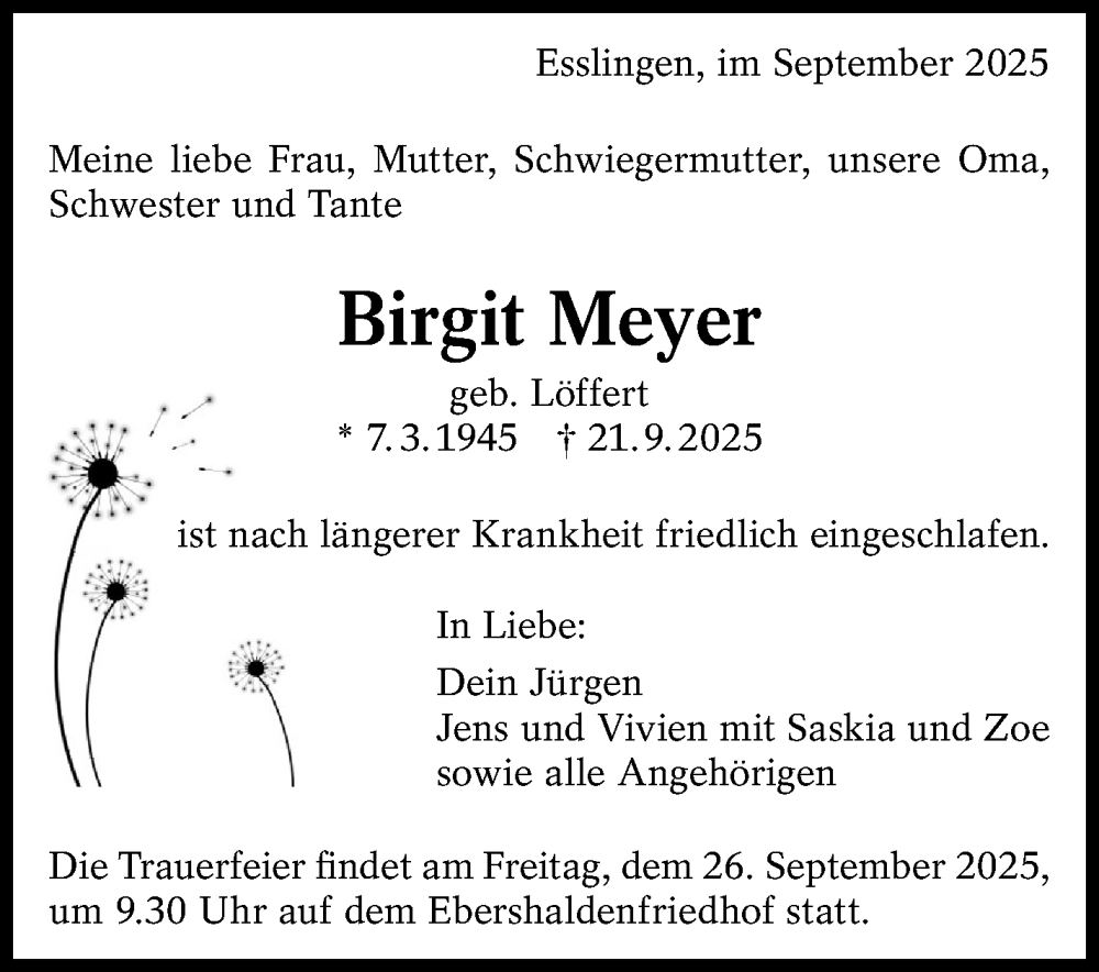 Hier finden Sie alle Traueranzeigen aus der Zeitung, die bisher für Birgit Meyer erschienen sind. Weitere Traueranzeigen, die in der Zeitung erscheinen, werden hier ebenfalls aufgelistet