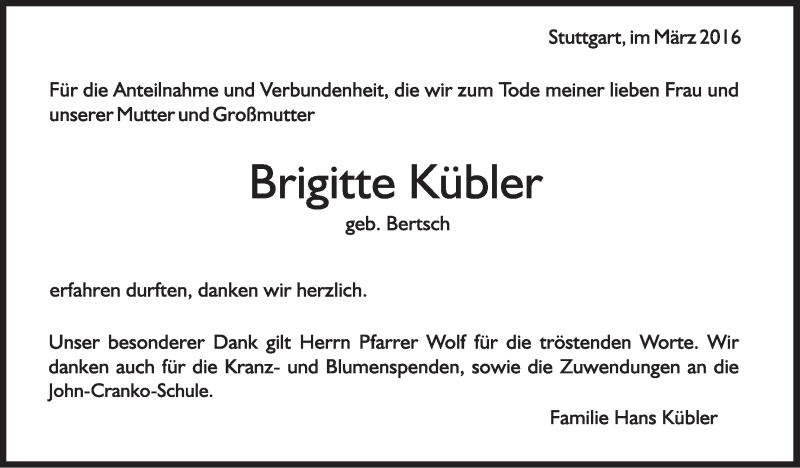 Hier finden Sie alle Traueranzeigen aus der Zeitung, die bisher für Brigitte Kübler erschienen sind. Weitere Traueranzeigen, die in der Zeitung erscheinen, werden hier ebenfalls aufgelistet