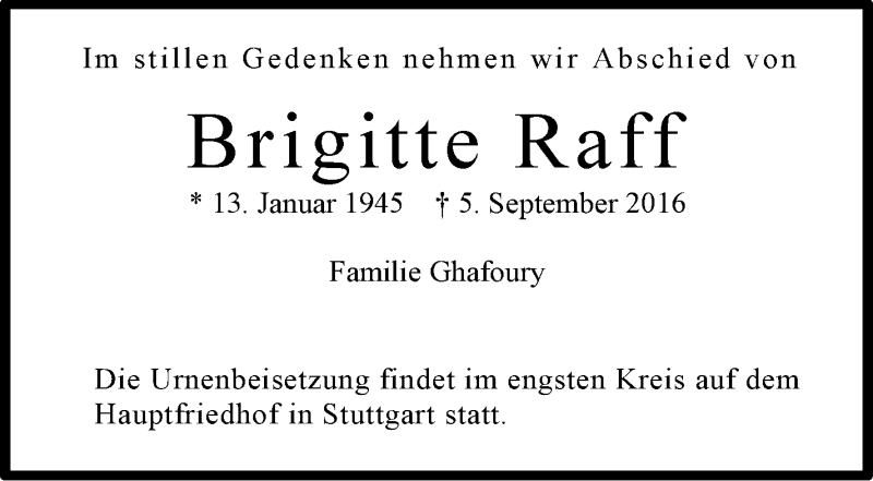 Hier finden Sie alle Traueranzeigen aus der Zeitung, die bisher für Brigitte Raff erschienen sind. Weitere Traueranzeigen, die in der Zeitung erscheinen, werden hier ebenfalls aufgelistet