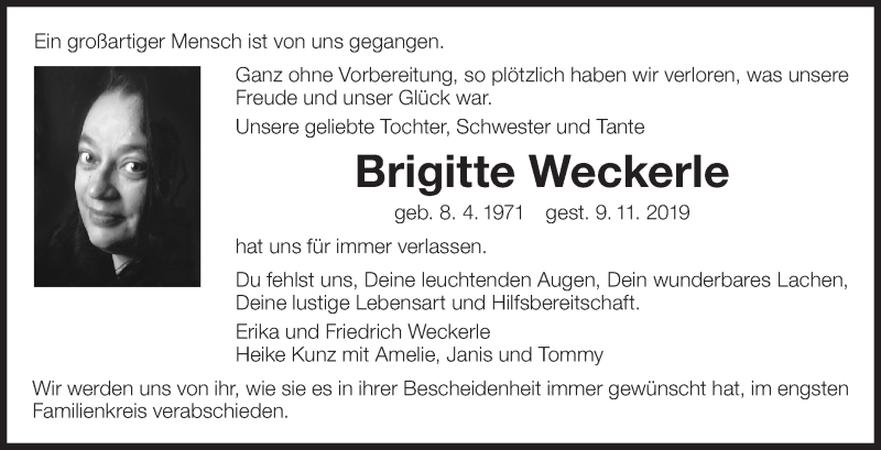 Hier finden Sie alle Traueranzeigen aus der Zeitung, die bisher für Brigitte Weckerle erschienen sind. Weitere Traueranzeigen, die in der Zeitung erscheinen, werden hier ebenfalls aufgelistet