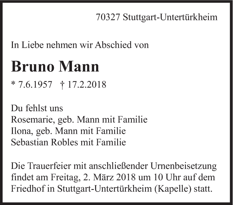 Hier finden Sie alle Traueranzeigen aus der Zeitung, die bisher für Bruno Mann erschienen sind. Weitere Traueranzeigen, die in der Zeitung erscheinen, werden hier ebenfalls aufgelistet
