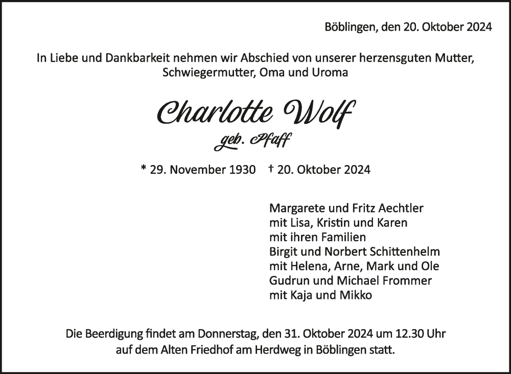 Hier finden Sie alle Traueranzeigen aus der Zeitung, die bisher für Charlotte Wolf erschienen sind. Weitere Traueranzeigen, die in der Zeitung erscheinen, werden hier ebenfalls aufgelistet