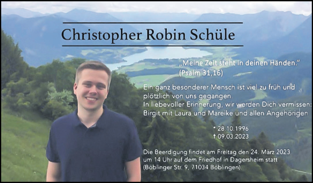 Hier finden Sie alle Traueranzeigen aus der Zeitung, die bisher für Christopher Robin Schüle erschienen sind. Weitere Traueranzeigen, die in der Zeitung erscheinen, werden hier ebenfalls aufgelistet