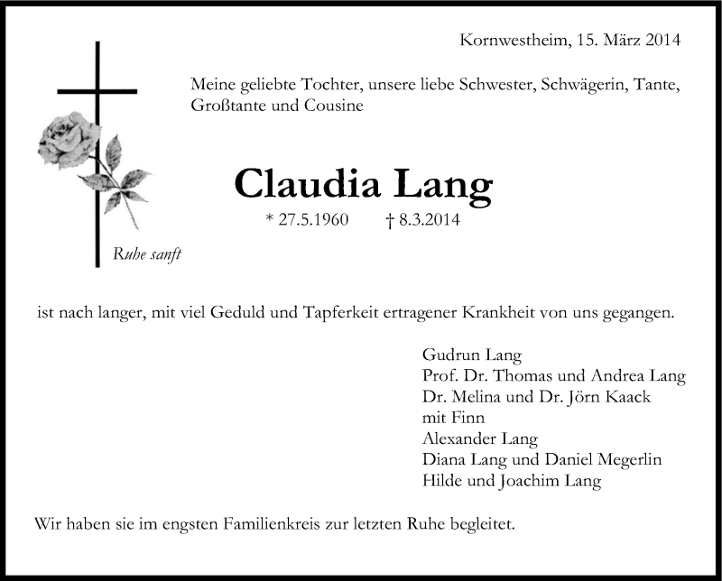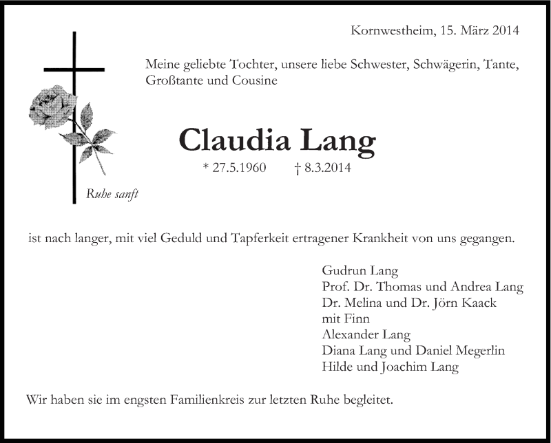 Hier finden Sie alle Traueranzeigen aus der Zeitung, die bisher für Claudia Lang erschienen sind. Weitere Traueranzeigen, die in der Zeitung erscheinen, werden hier ebenfalls aufgelistet