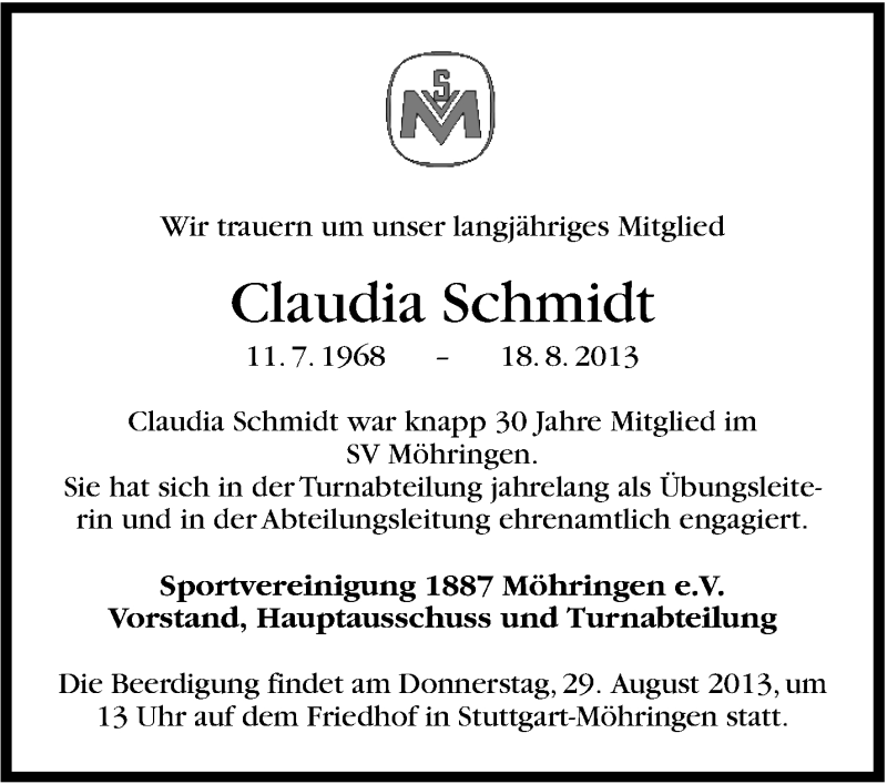 Hier finden Sie alle Traueranzeigen aus der Zeitung, die bisher für Claudia Schmidt erschienen sind. Weitere Traueranzeigen, die in der Zeitung erscheinen, werden hier ebenfalls aufgelistet