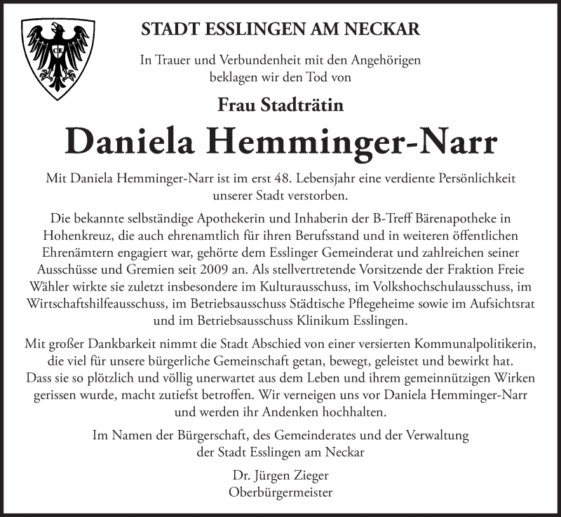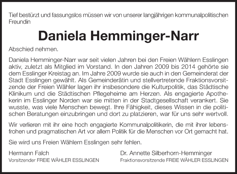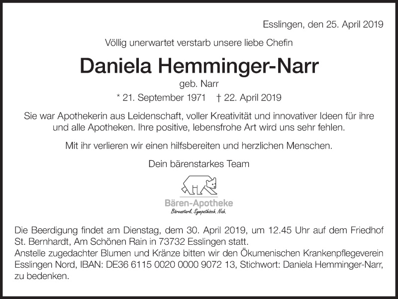 Hier finden Sie alle Traueranzeigen aus der Zeitung, die bisher für Daniela Hemminger-Narr erschienen sind. Weitere Traueranzeigen, die in der Zeitung erscheinen, werden hier ebenfalls aufgelistet