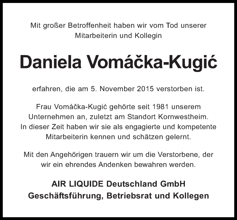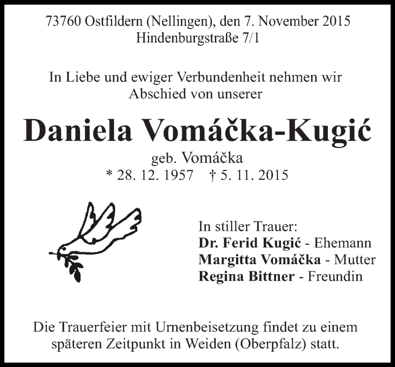 Hier finden Sie alle Traueranzeigen aus der Zeitung, die bisher für Daniela Vomácka-Kugic erschienen sind. Weitere Traueranzeigen, die in der Zeitung erscheinen, werden hier ebenfalls aufgelistet