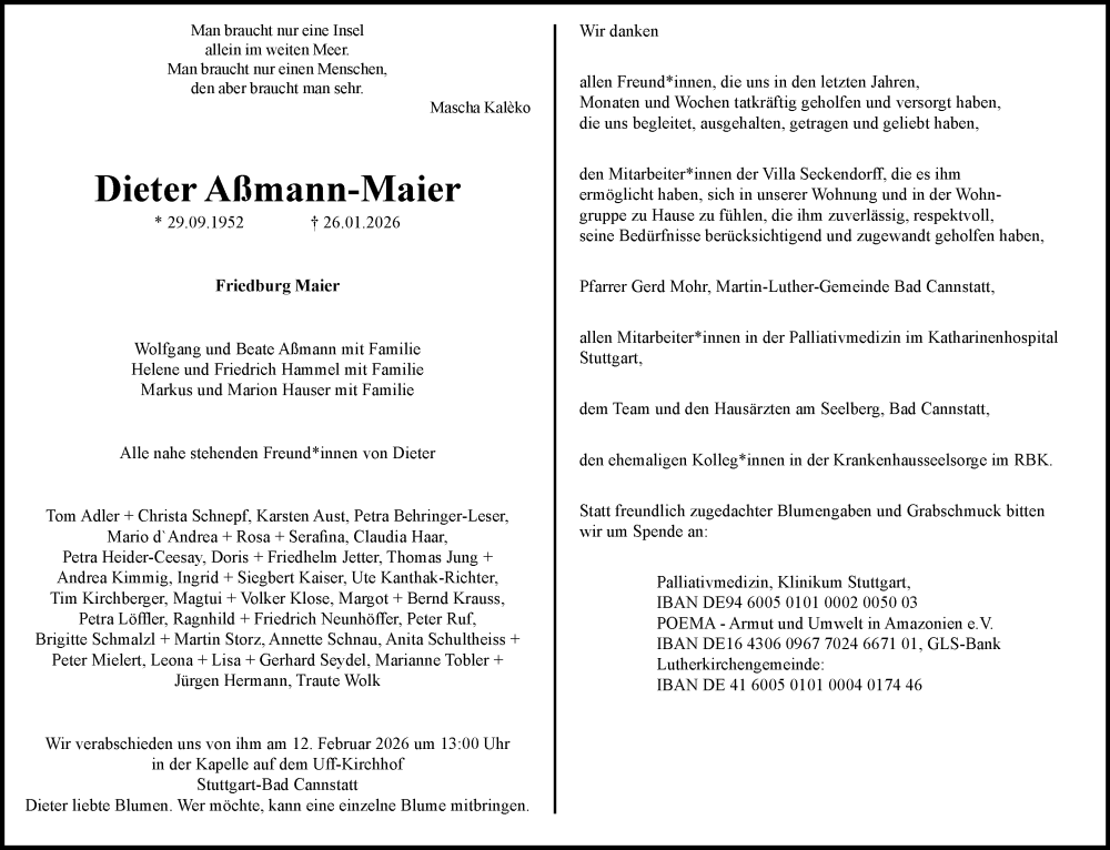 Hier finden Sie alle Traueranzeigen aus der Zeitung, die bisher für Dieter Aßmann-Maier erschienen sind. Weitere Traueranzeigen, die in der Zeitung erscheinen, werden hier ebenfalls aufgelistet