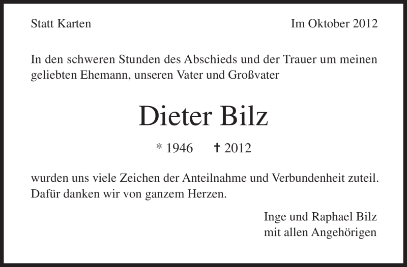 Hier finden Sie alle Traueranzeigen aus der Zeitung, die bisher für Dieter Bilz erschienen sind. Weitere Traueranzeigen, die in der Zeitung erscheinen, werden hier ebenfalls aufgelistet