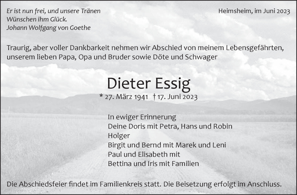 Hier finden Sie alle Traueranzeigen aus der Zeitung, die bisher für Dieter Essig erschienen sind. Weitere Traueranzeigen, die in der Zeitung erscheinen, werden hier ebenfalls aufgelistet