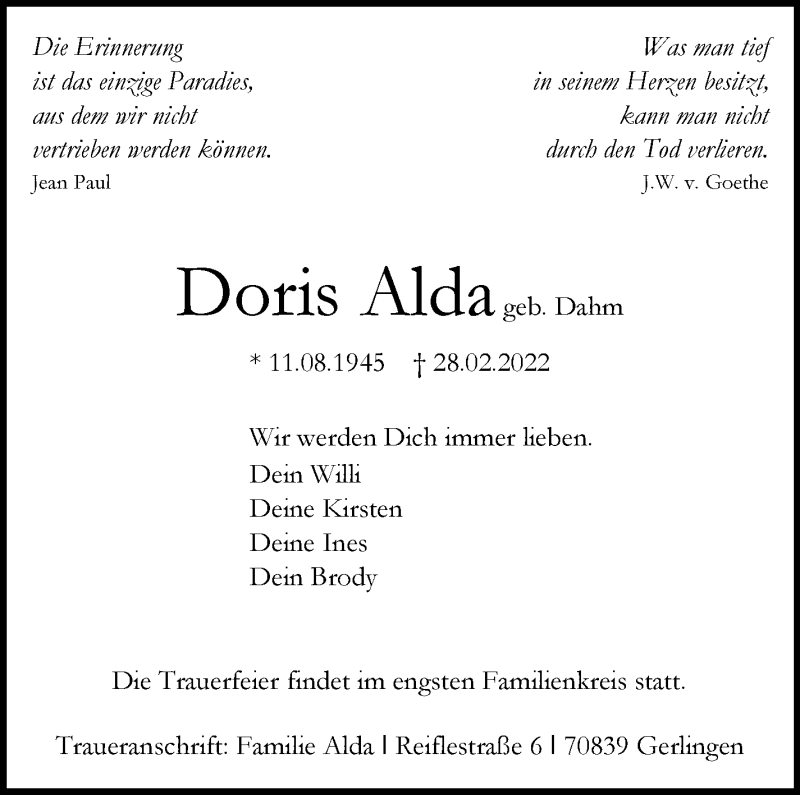 Hier finden Sie alle Traueranzeigen aus der Zeitung, die bisher für Doris Alda erschienen sind. Weitere Traueranzeigen, die in der Zeitung erscheinen, werden hier ebenfalls aufgelistet
