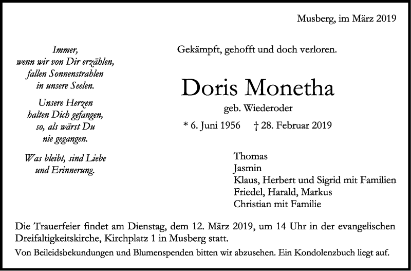 Hier finden Sie alle Traueranzeigen aus der Zeitung, die bisher für Doris Monetha erschienen sind. Weitere Traueranzeigen, die in der Zeitung erscheinen, werden hier ebenfalls aufgelistet