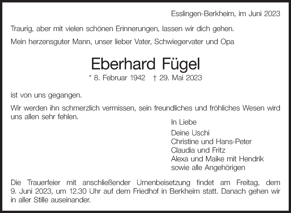 Hier finden Sie alle Traueranzeigen aus der Zeitung, die bisher für Eberhard Fügel erschienen sind. Weitere Traueranzeigen, die in der Zeitung erscheinen, werden hier ebenfalls aufgelistet