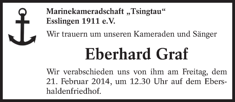 Hier finden Sie alle Traueranzeigen aus der Zeitung, die bisher für Eberhard Graf erschienen sind. Weitere Traueranzeigen, die in der Zeitung erscheinen, werden hier ebenfalls aufgelistet