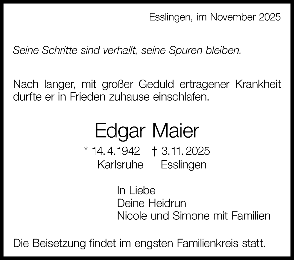 Hier finden Sie alle Traueranzeigen aus der Zeitung, die bisher für Edgar Maier erschienen sind. Weitere Traueranzeigen, die in der Zeitung erscheinen, werden hier ebenfalls aufgelistet
