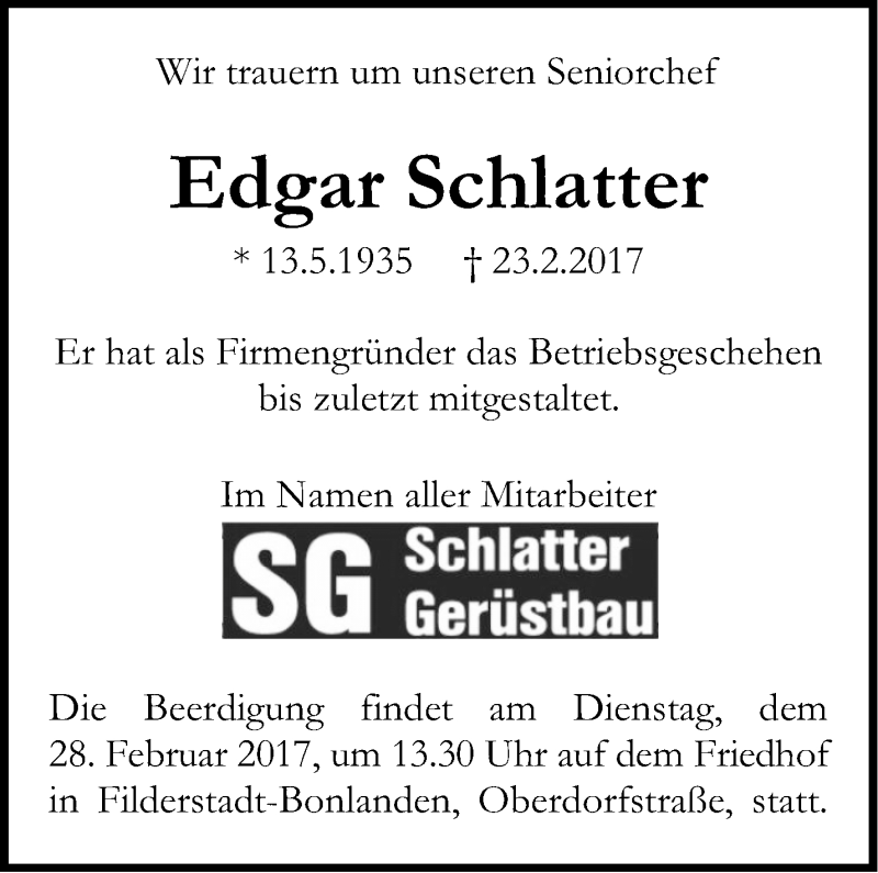 Hier finden Sie alle Traueranzeigen aus der Zeitung, die bisher für Edgar Schlatter erschienen sind. Weitere Traueranzeigen, die in der Zeitung erscheinen, werden hier ebenfalls aufgelistet