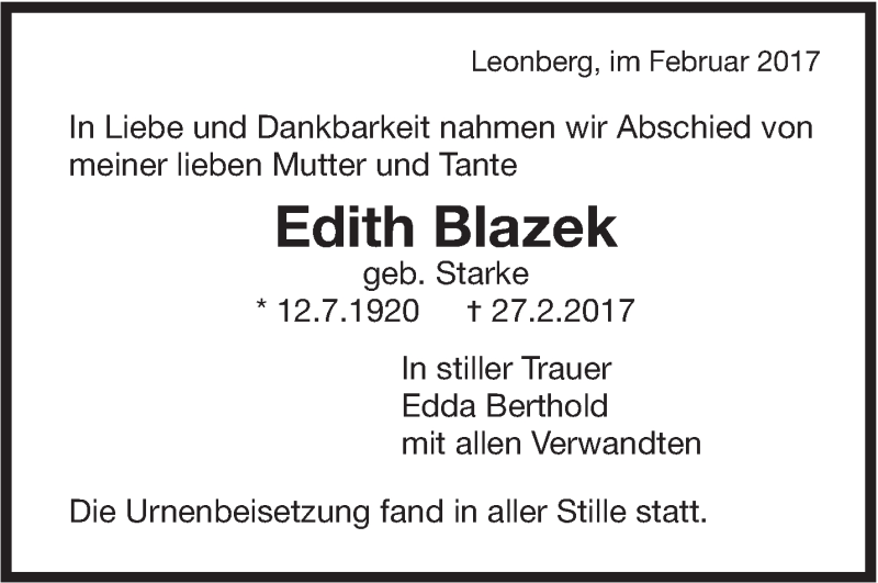 Hier finden Sie alle Traueranzeigen aus der Zeitung, die bisher für Edith Blazek erschienen sind. Weitere Traueranzeigen, die in der Zeitung erscheinen, werden hier ebenfalls aufgelistet