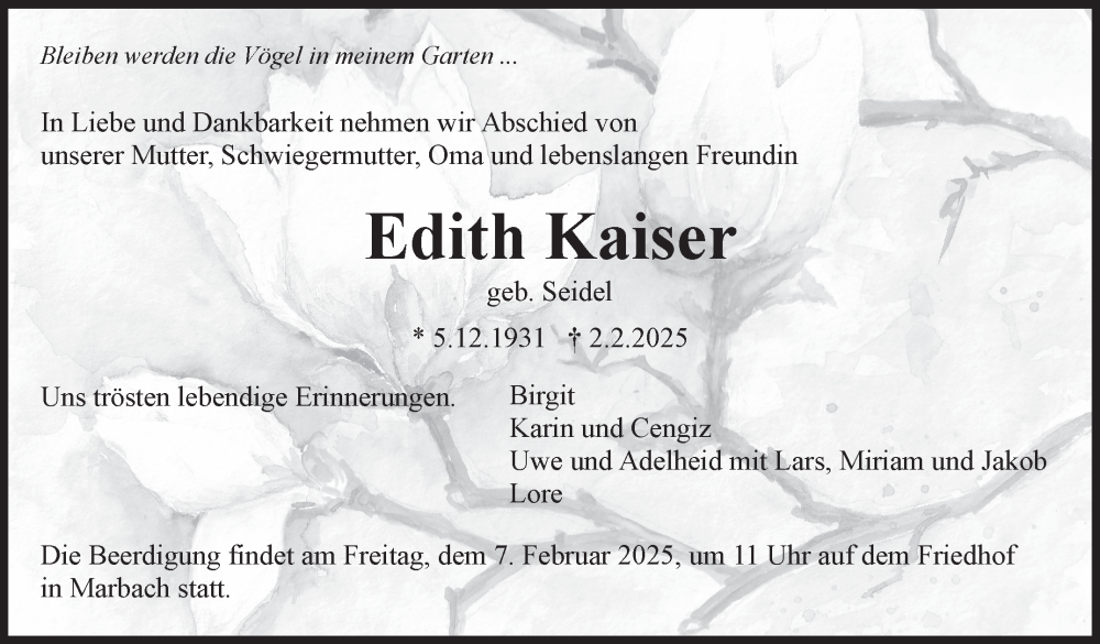 Hier finden Sie alle Traueranzeigen aus der Zeitung, die bisher für Edith Kaiser erschienen sind. Weitere Traueranzeigen, die in der Zeitung erscheinen, werden hier ebenfalls aufgelistet