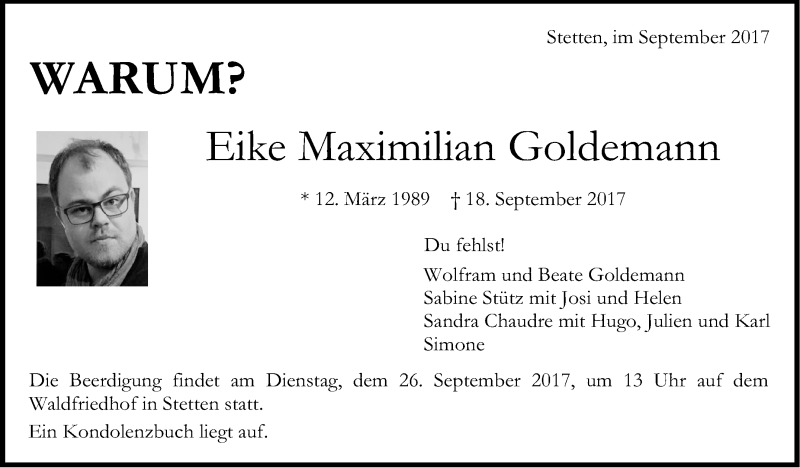 Hier finden Sie alle Traueranzeigen aus der Zeitung, die bisher für Eike Maximilian Goldemann erschienen sind. Weitere Traueranzeigen, die in der Zeitung erscheinen, werden hier ebenfalls aufgelistet