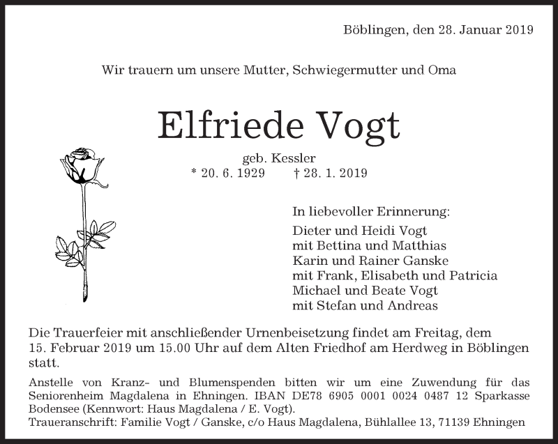Hier finden Sie alle Traueranzeigen aus der Zeitung, die bisher für Elfriede Vogt erschienen sind. Weitere Traueranzeigen, die in der Zeitung erscheinen, werden hier ebenfalls aufgelistet