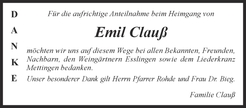 Hier finden Sie alle Traueranzeigen aus der Zeitung, die bisher für Emil Clauß erschienen sind. Weitere Traueranzeigen, die in der Zeitung erscheinen, werden hier ebenfalls aufgelistet