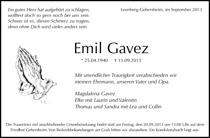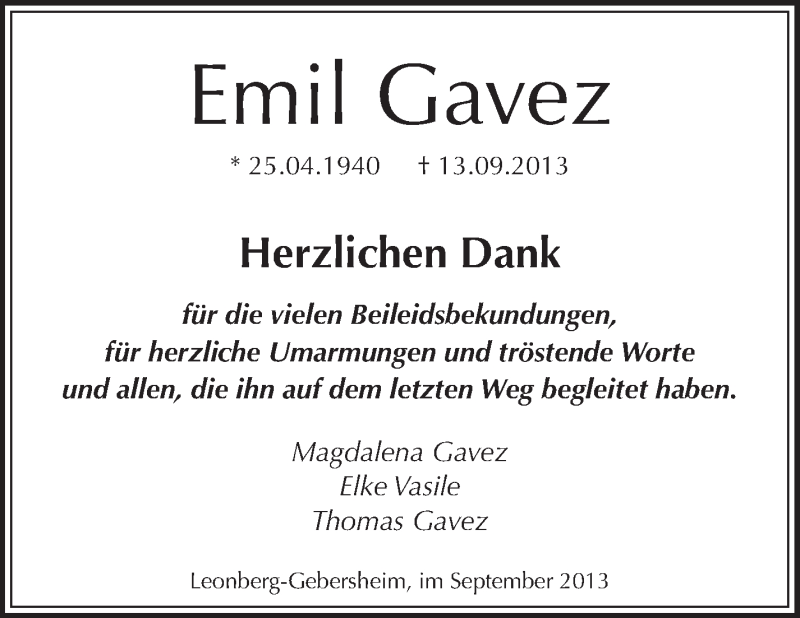 Hier finden Sie alle Traueranzeigen aus der Zeitung, die bisher für Emil Gavez erschienen sind. Weitere Traueranzeigen, die in der Zeitung erscheinen, werden hier ebenfalls aufgelistet