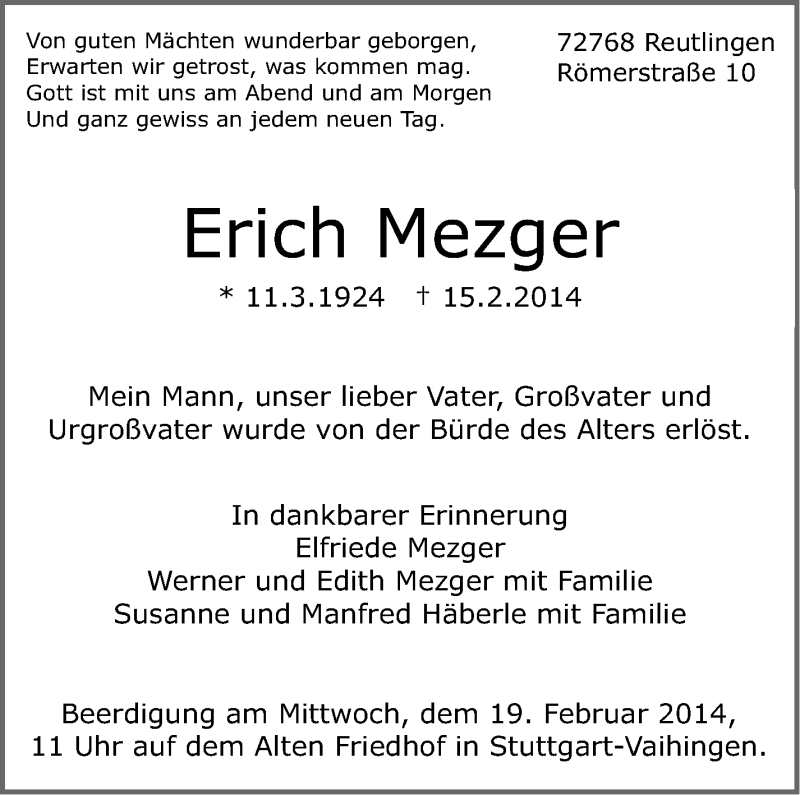 Hier finden Sie alle Traueranzeigen aus der Zeitung, die bisher für Erich Mezger erschienen sind. Weitere Traueranzeigen, die in der Zeitung erscheinen, werden hier ebenfalls aufgelistet