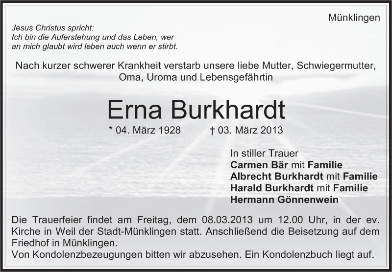 Hier finden Sie alle Traueranzeigen aus der Zeitung, die bisher für Erna Burkhardt erschienen sind. Weitere Traueranzeigen, die in der Zeitung erscheinen, werden hier ebenfalls aufgelistet