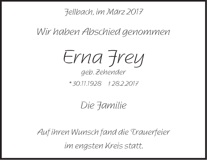 Hier finden Sie alle Traueranzeigen aus der Zeitung, die bisher für Erna Frey erschienen sind. Weitere Traueranzeigen, die in der Zeitung erscheinen, werden hier ebenfalls aufgelistet