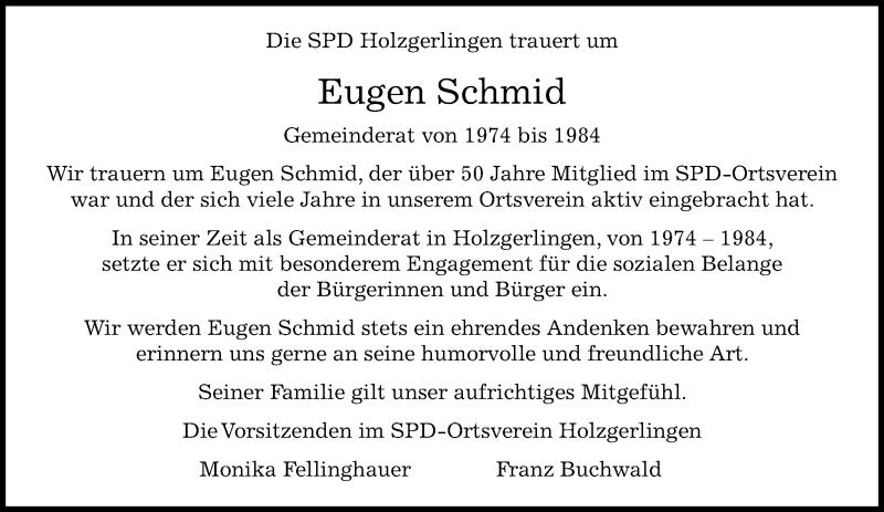 Hier finden Sie alle Traueranzeigen aus der Zeitung, die bisher für Eugen Schmid erschienen sind. Weitere Traueranzeigen, die in der Zeitung erscheinen, werden hier ebenfalls aufgelistet