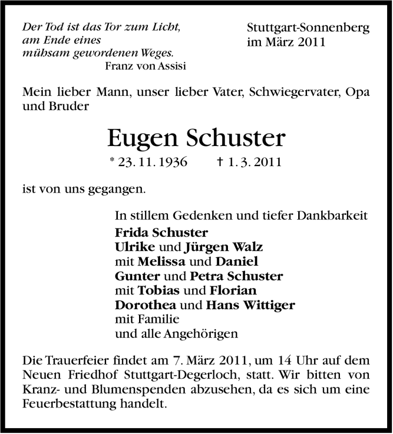 Hier finden Sie alle Traueranzeigen aus der Zeitung, die bisher für Eugen Schuster erschienen sind. Weitere Traueranzeigen, die in der Zeitung erscheinen, werden hier ebenfalls aufgelistet